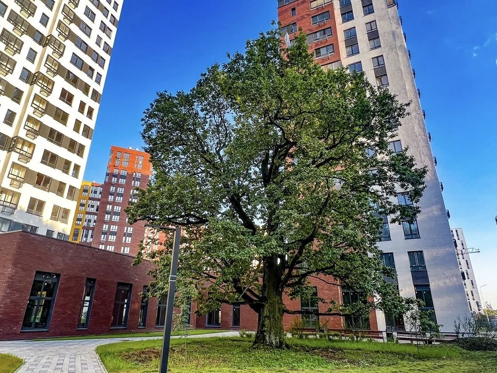 Рядом с домом №4 растет столетний дуб. Перед началом строительных работ дендрологи и специалисты ГК «А101» осмотрели дерево, оградили забором и поставили под круглосуточное наблюдение. В течение всего периода строительства специалисты вели регулярный уход за дубом, который включает в себя обработку кроны, рыхление и удобрение почвы, обработку всего дерева для защиты от болезней и вредителей и т.п. Уход и наблюдение за дубом продолжится и после заселения дома.